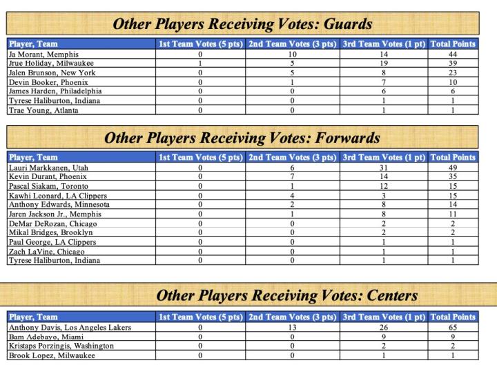 在未入选最佳阵容的球员中,浓眉的得票最高,马尔卡宁、莫兰特紧随其后。