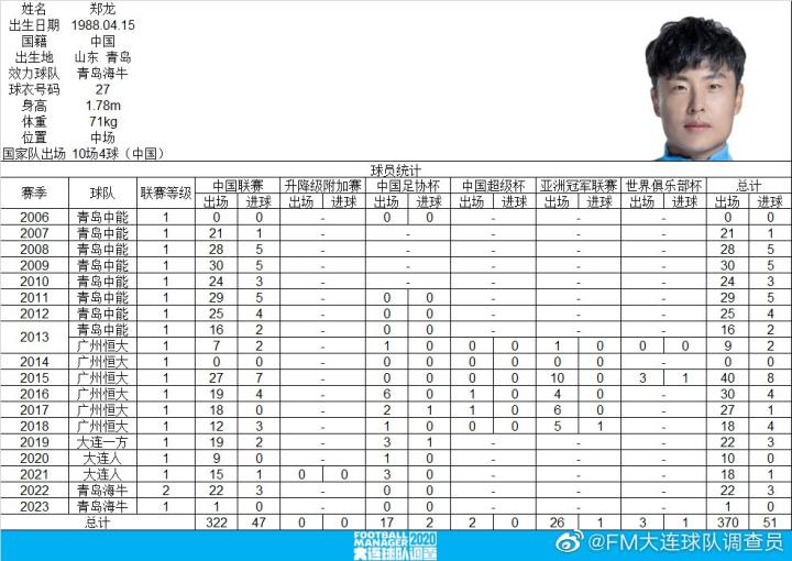 本轮客战上海海港,郑龙作为队长代表青岛海牛首发出战,迎来新赛季首次亮相。博主“FM大连球队调查员”表示:郑龙在中国顶级联赛出场300场,成为第39位达成此项成就的球员,88年龄段国内第2人。