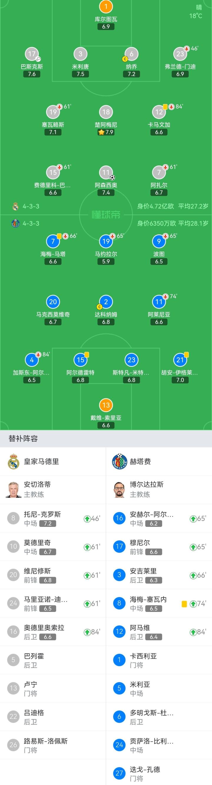 皇家马德里首发:1-库尔图瓦、23-弗兰德-门迪(46'8-托尼-克罗斯)、6-纳乔、3-米利唐、17-巴斯克斯、18-楚阿梅尼、12-卡马文加(84'16-奥德里奥索拉)、19-塞瓦略斯(61'24-马里亚诺-迪亚斯)、15-费德里科-巴尔韦德(61'10-莫德里奇)、11-阿森西奥、7-阿扎尔(61'20-维尼修斯)