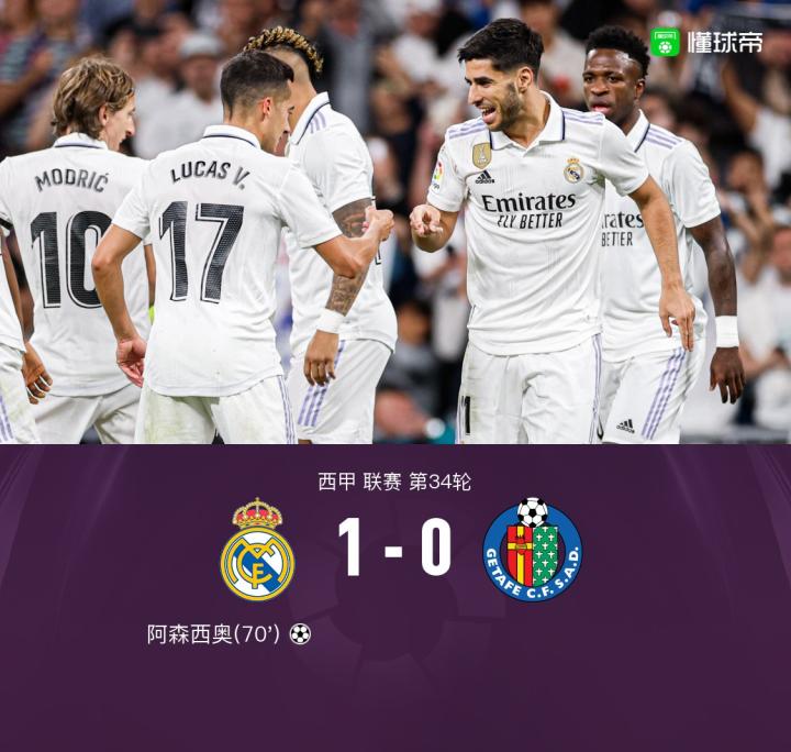北京时间5月14日03:00,西甲第34轮继续进行,皇家马德里坐镇主场伯纳乌球场迎战赫塔费,本场主裁判为胡安-马丁内斯。上半场,比赛乏善可陈,阿森西奥失良机。下半场,阿森西奥远射一剑封喉,维尼修斯进球越位无效,卡马文加伤退。最终,皇马主场1-0小胜赫塔费。
