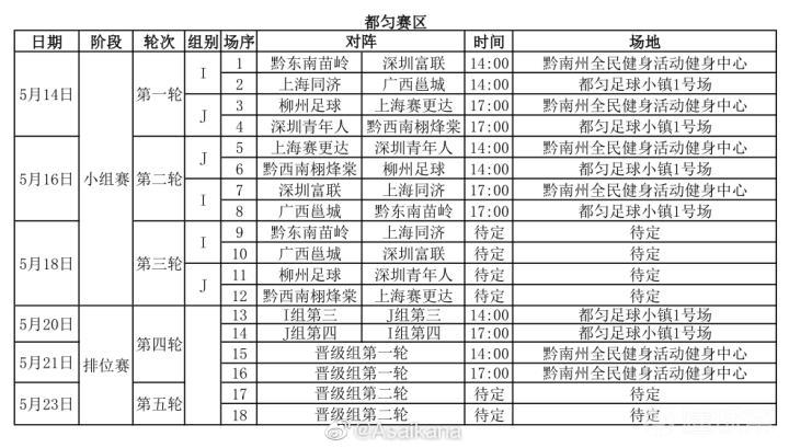 重磅!5天打12场外战,广西足球六线作战 5天打12场外战,广西足球将六线作战:中甲、女甲等先后迎来四场“两广德比”;中乙联赛将在柳州迎来榜首大战,三名广西队长率队再战绿茵;中国足协杯开幕式落户南宁,广西骏菱代表广西出战;周末中冠大区赛,两支广西球队将分别两支上海球队、两支贵州球队、两支深圳球队。 5月14日15:00,广州越秀山体育场 中甲第五轮:广州队VS广西平果哈嘹 5月14日16:00,柳州市体育中心 中乙第三轮:广西蓝航VS江西黑马青年 5月14日14:00,都匀足球小镇1号场 中冠I组:广西邕城VS上海同济 5月14日17:00,黔南州全民健身活动健身中心 中冠J组:柳州足球VS上海赛更达 5月15日14:15,海口观澜湖国际足球训练基地5号场 女甲联赛第四轮:广西平果呗侬女足VS武体青山女足 5月16日14:00,都匀足球小镇1号场 中冠J组:柳州足球VS黔西南栩烽棠 5月16日17:00,都匀足球小镇1号场 中冠I组:广西邕城VS黔东南苗岭 5月17日19:30,广西体育中心主体育场 中国足协杯揭幕战:广西骏菱VS湖北青年星 5月17日15:30,武汉新华路体育场 中国足协杯第一轮:武汉小马过河VS广西蓝航 5月18日14:15,海口观澜湖国际足球训练基地5号场 女甲联赛第五轮:广西平果呗侬女足VS大连人女足 5月18日,时间地点待定 中冠J组:柳州足球VS深圳青年人 5月18日,时间地点待定 中冠I组:广西邕城VS深圳富联