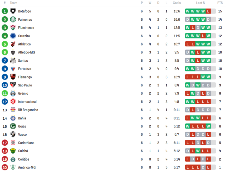 北京时间5月14日-5月15日,2023赛季巴西足球甲级联赛结束了第6轮的争夺。