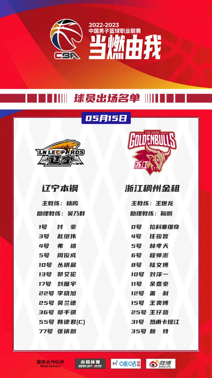 经过前3场对决之后,辽宁队顺利拿到赛点,浙江队则到了背水一战的地步。主帅杨鸣安排的首发阵容依然是:赵继伟、弗格、韩德君、李晓旭、张镇麟;浙江队主教练王世龙安排的首发阵容也仍为:拉科塞维奇、程帅澎、王奕博、陆文博、余嘉豪。吴前继续缺席。