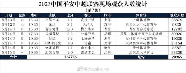 中超第7轮现场观众:成都主场39920人最多,国安主场32239人ETChalmers @懂球帝2023-05-15 22:00中超第7轮战罢,本轮现场观众人数统计出炉,成都vs亚泰39920人最多,场均20965人。中超第7轮8场比赛总观众为167716人次,场均20965人。中超第7轮现场观众人数统计上海申花vs武汉三镇 28879人深圳vs大连人 9825人青岛海牛vs梅州客家 12783人成都蓉城vs长春亚泰 39920人浙江vs上海海港 10329人天津津门虎vs河南 25154人沧州雄狮vs山东泰山 8587人北京国安vs南通支云 32239人数据来源:@Asaikana 展开更多