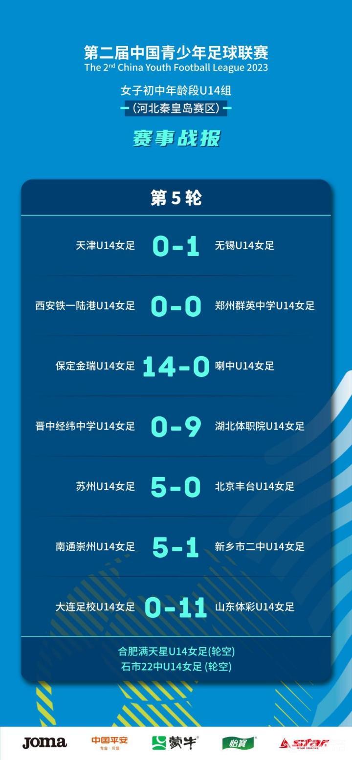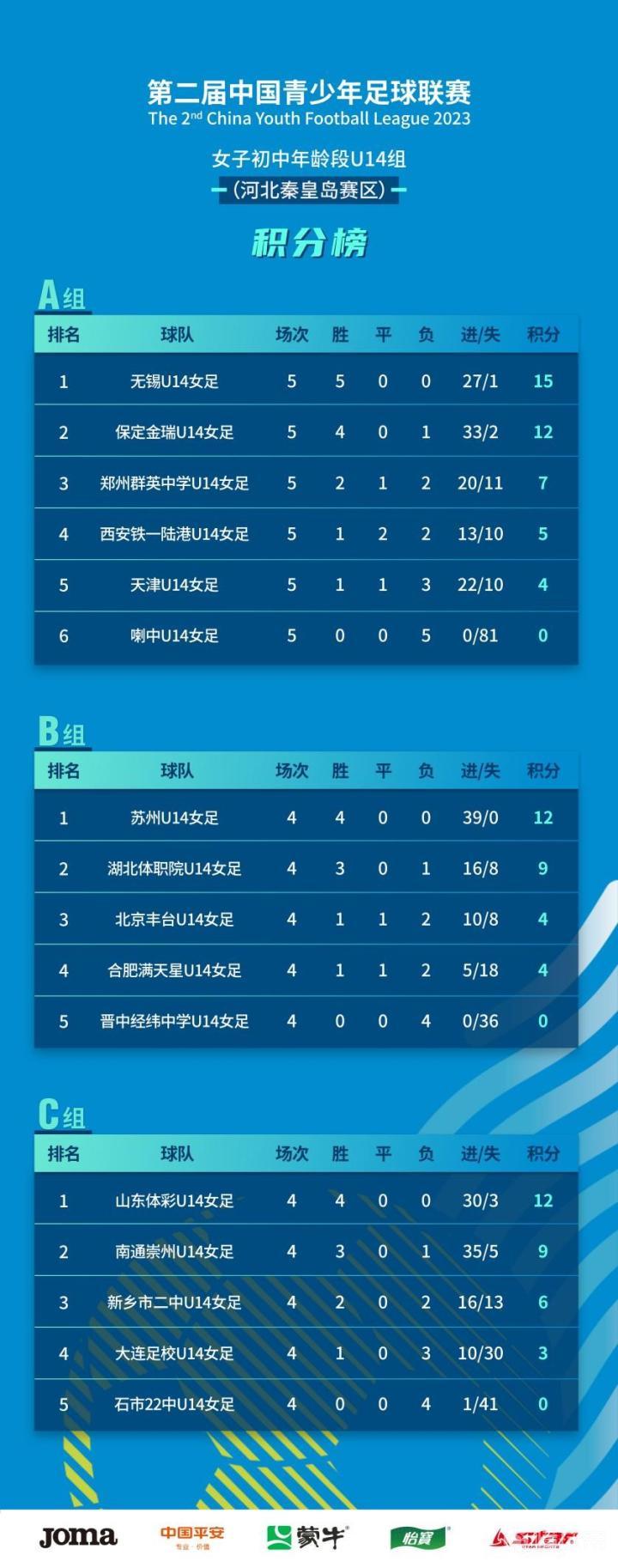 在秦皇岛赛区进行的A组最后一轮比赛中,郑州群英中学U14女足和西安铁一陆港U14女足直接竞争一个出线席位,最终两队0-0战平,前者以2个积分的优势获得小组第三名,和小组前两名无锡U14女足、保定金瑞U14女足携手出线。B组中,苏州U14女足、湖北体职院U14女足和北京丰台U14女足分列前三名。C组中,晋级的球队分别是山东体彩U14女足、南通崇州U14女足和新乡市二中U14女足。