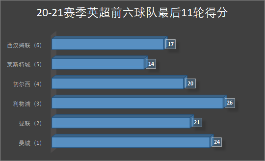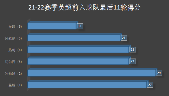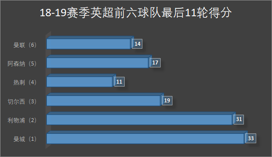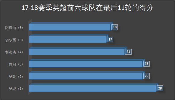 如果以进入2018年3月作为冲刺阶段的起点,曼城在最后11轮所取得的成绩是9胜1平1负,虽然2:3输给了争冠直接对手曼联,但胜在拿分稳定,直接夺取28分。