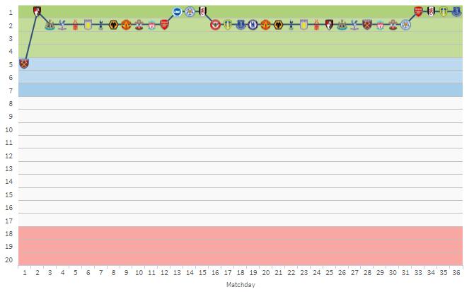 本赛季,阿森纳的复兴态势让人眼前一亮,曼城在很长一段时间都处于被压制阶段,最多时落后阿森纳达到8分。在第33轮之前,曼城在积分榜上的排名都只能屈居第二。