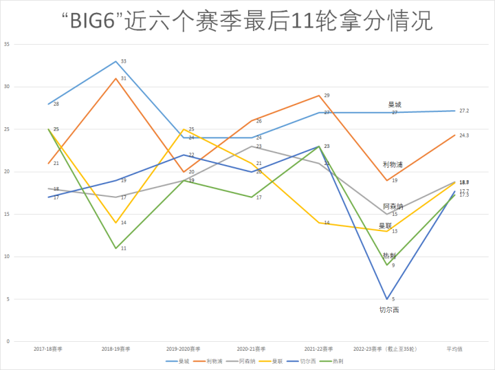在2017~18至2022~23的6个赛季间(本赛季截止至第35轮),曼城在冲刺阶段平均拿到27.2分,相当于每场比赛拿到2.5分,毫无悬念位居联赛第一。