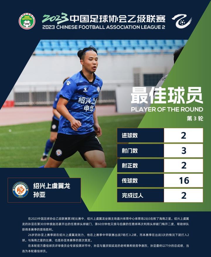 北京时间5月16日,中乙联赛官方宣布,绍兴上虞翼龙中场孙亚当选中乙第3轮最佳球员。
