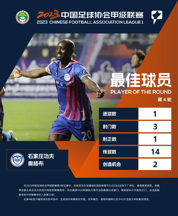 中甲官方:石家庄功夫队前锋奥格布当选第4轮最佳球员盖坦92023-05-16 18:53北京时间5月16日,中甲联赛官方宣布,石家庄功夫队前锋奥格布当选第4轮最佳球员。中甲联赛官方写道:“在2023中国足球协会甲级联赛第4轮比赛中,石家庄功夫足球俱乐部坐镇裕彤国际体育中心以2比0击败了广州队,拿到赛季首胜。本赛季加盟石家庄功夫的尼日利亚前锋奥格布,在比赛第45分钟接张兴博开出的角球头球破门,帮助球队打开胜利之门,这也是奥格布在中甲联赛中打入的第25球。”奥格布破门GIF展开更多