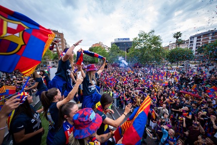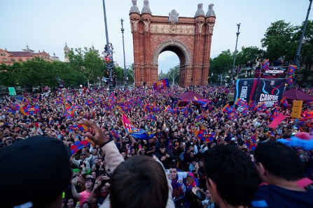 5月15日,从Spotify诺坎普球场到凯旋门,数以万计球迷涌上街头、欢欣雀跃,与巴塞罗那足球俱乐部男队和女队一同庆祝他们双双夺得联赛冠军。