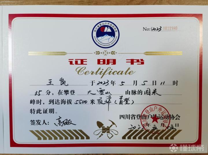 5月15日,四川省登山户外运动协会正式向王凯和HUGO颁发了登顶证书,上面写着二人分别于2023年5月5日10:30和11:35,在攀登大雪山山脉的国米峰时,到达海拔5500米顶峰(首登)。