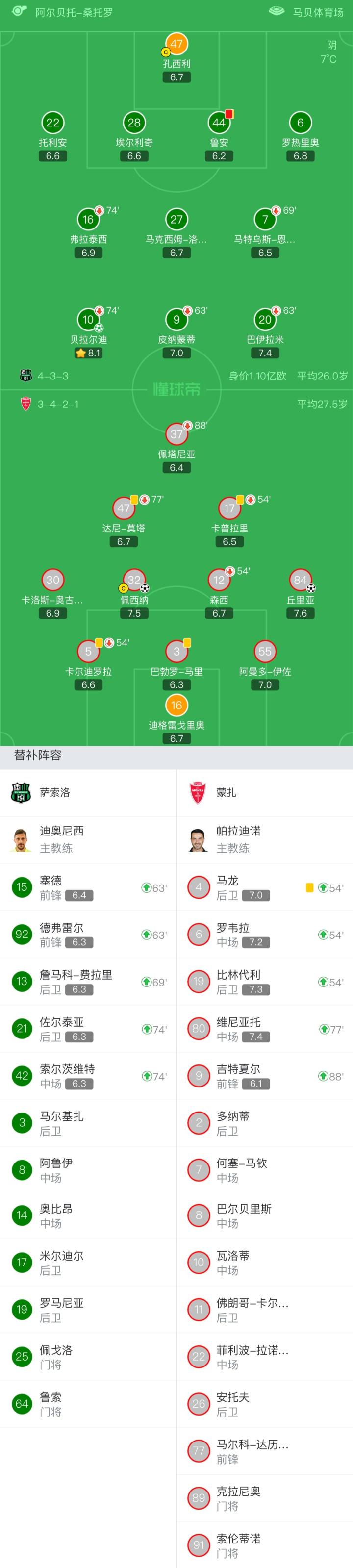 萨索洛首发:47-孔西利、22-托利安、44-鲁安、28-埃尔利奇、6-罗热里奥、7-马特乌斯-恩里克(69'13-詹马科-费拉里)、16-弗拉泰西(74'21-佐尔泰亚)、27-马克西姆-洛佩斯、20-巴伊拉米(63'15-塞德)、9-皮纳蒙蒂(63'92-德弗雷尔)、10-贝拉尔迪(74'42-索尔茨维特)
