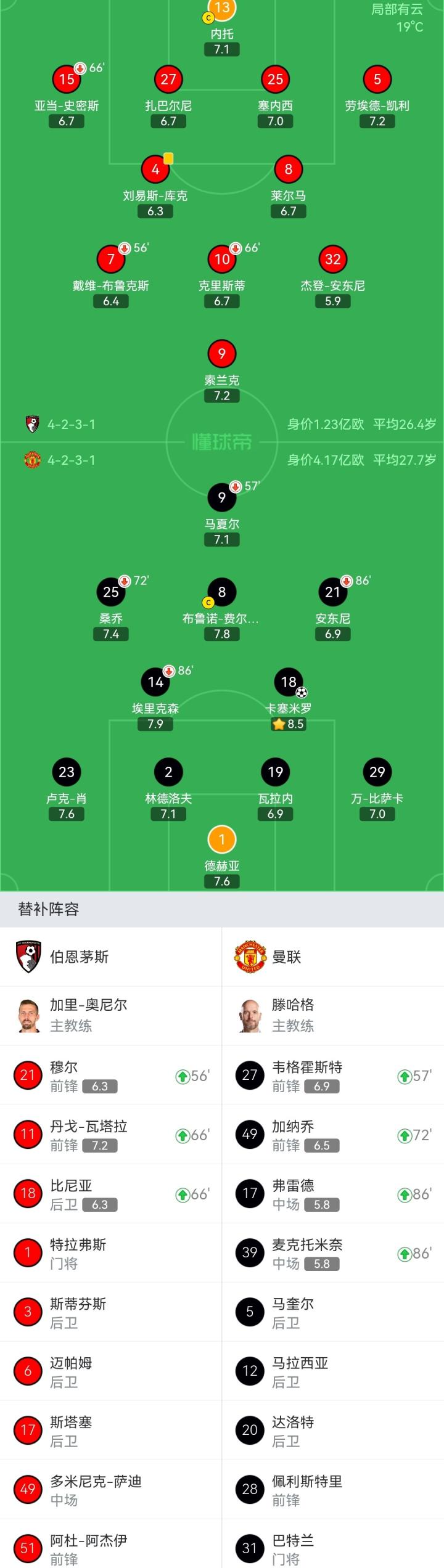 曼联首发:1-德赫亚、23-卢克-肖、2-林德洛夫、19-瓦拉内、29-万-比萨卡、14-埃里克森(86'39-麦克托米奈)、18-卡塞米罗、8-布鲁诺-费尔南德斯、25-桑乔(72'49-加纳乔)、21-安东尼(86'17-弗雷德)、9-马夏尔(57'27-韦格霍斯特)