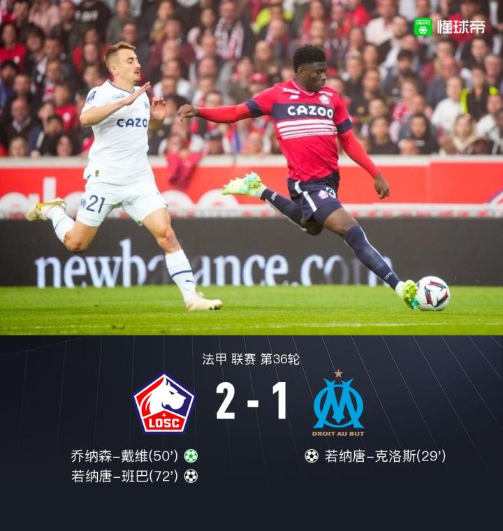 北京时间5月21日3:00,法甲第36轮,里尔主场对阵马赛。上半场,巴莱巴远射打偏,若纳唐-克洛斯捅射破门。下半场,保-洛佩斯送点,乔纳森-戴维点射破门,桑切斯破门被吹越位在先,若纳唐-班巴头球破门,最终,里尔2-1马赛。