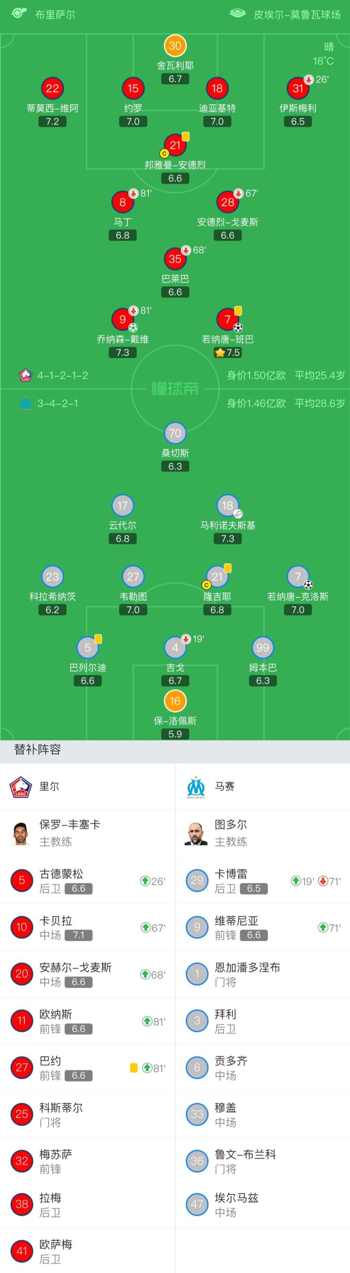 马赛首发:16-保-洛佩斯、5-巴列尔迪、4-吉戈(19'29-卡博雷(71'9-维蒂尼亚))、99-姆本巴、23-科拉希纳茨、27-韦勒图、21-隆吉耶、7-若纳唐-克洛斯、18-马利诺夫斯基、17-云代尔、70-桑切斯
