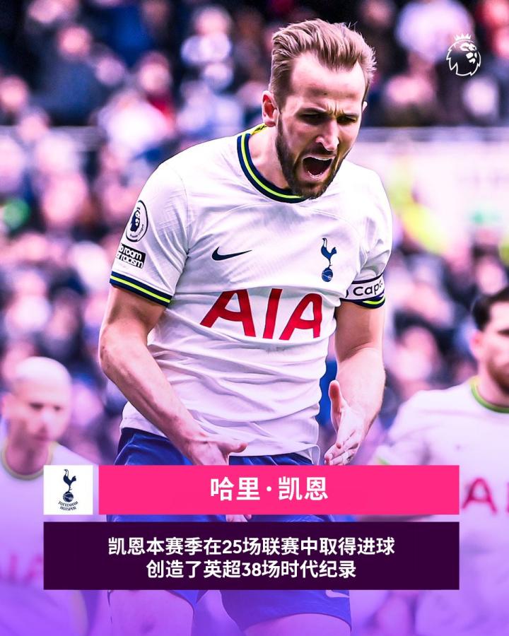 凯恩已在25场联赛中取得进球,创造了英超38轮时代的纪录