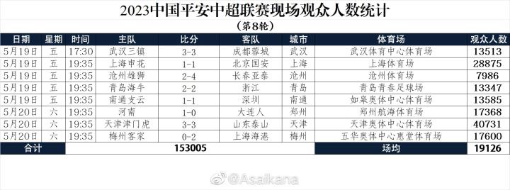 中超第8轮现场观众:津门虎vs山东40731人最多,场均19126人ETChalmers @懂球帝2023-05-21 10:46中超第8轮全部战罢,本轮现场观众人数统计出炉,津门虎vs山东40731人最多,场均19126人。中超第8轮现场观众人数合计153005人次,场均19126人。中超第8轮现场观众人数武汉三镇vs成都蓉城 13513人上海申花vs北京国安 28875人沧州雄狮vs长春亚泰 7986人青岛海牛vs浙江 13347人南通支云vs深圳 13585人河南vs大连人 17368人天津津门虎vs山东泰山 40731人梅州客家vs上海海港 17600人数据来源:@Asaikana 展开更多