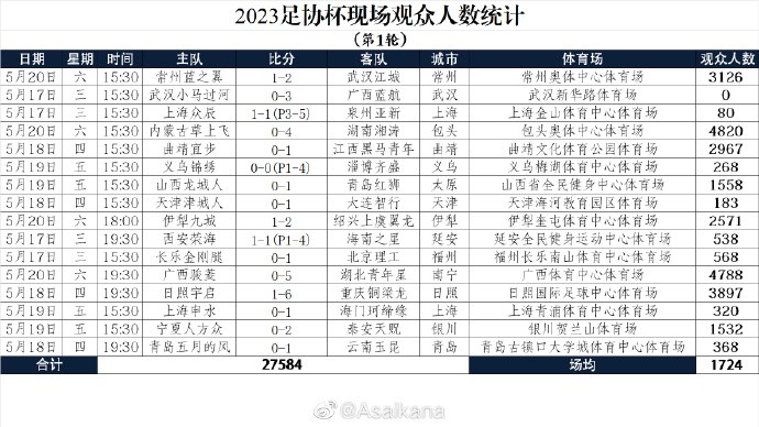 足协杯观众人数:内蒙古vs湘涛以4820人居首,场均1724人