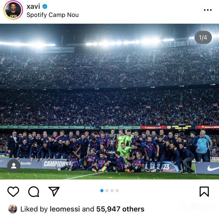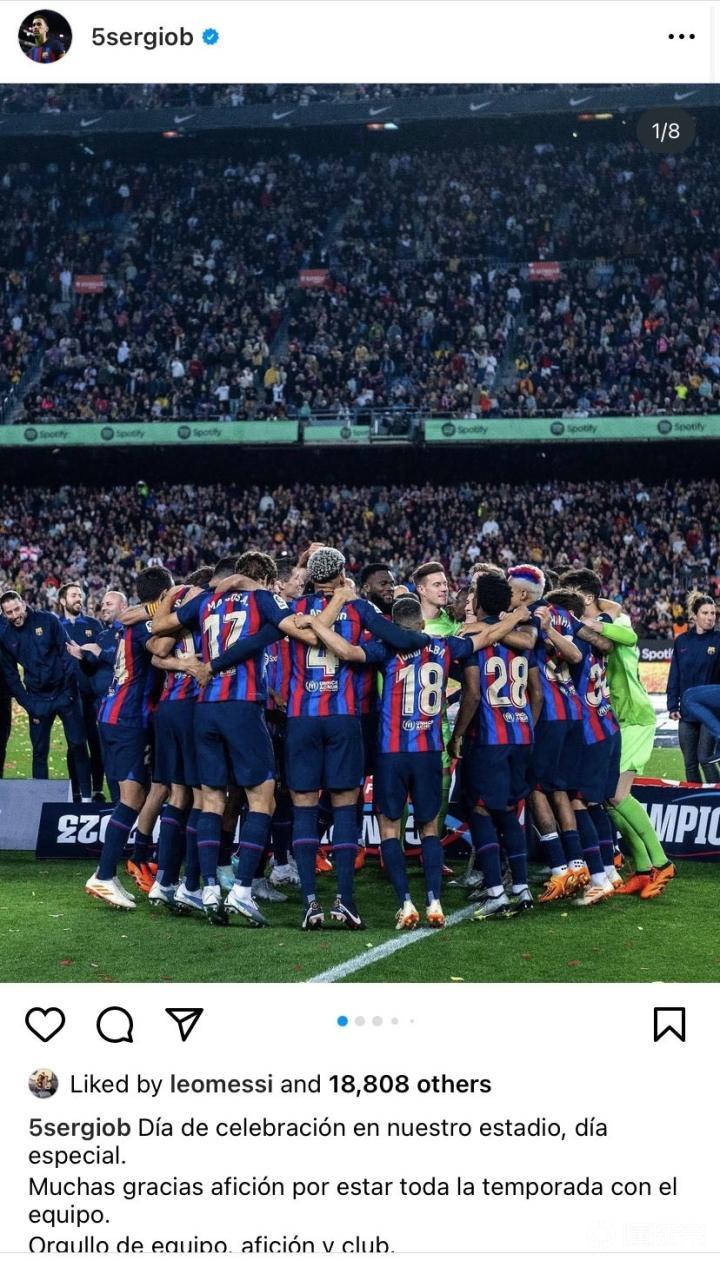 点赞达人,布斯克茨、哈维、阿尔巴晒西甲捧杯照,梅西点赞