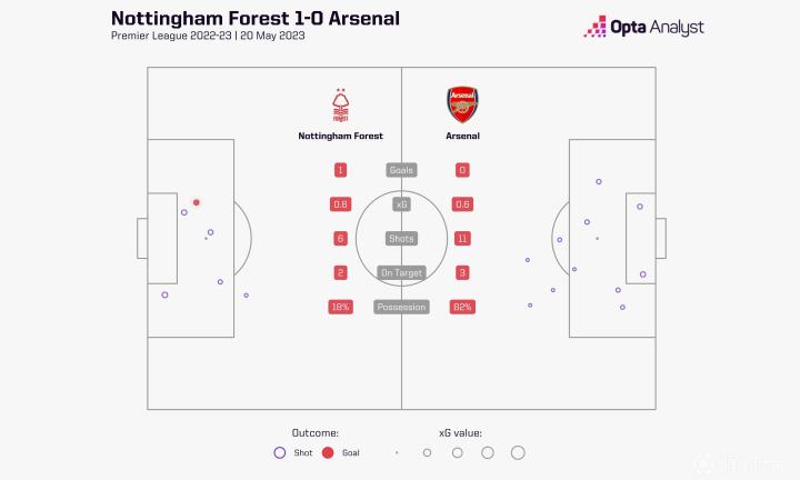 (图)阿森纳的控球率高达82%,没能创造出什么有威胁的进攻机会,两次必进球机会都属于诺丁汉森林。