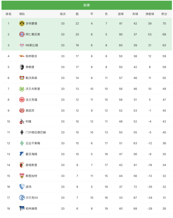 (2)争四:德甲的四个欧冠名额已经锁定三个,第四个名额将从柏林联合和弗赖堡之间产生。两队目前同分,柏林联合以4个净胜球的优势略微领先。