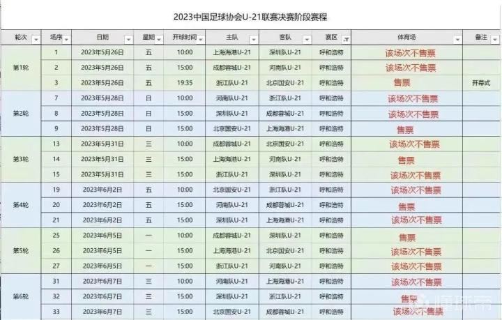 U21联赛决赛第一阶段呼和浩特赛区部分场次开放,票价30元