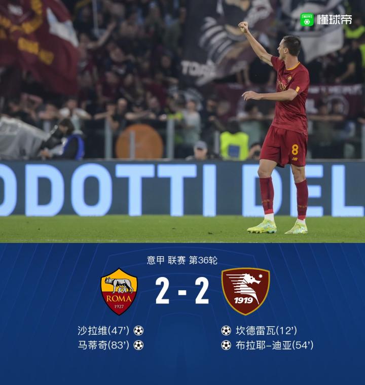 第83分钟,马蒂奇禁区内迎球劲射破门,罗马2-2萨勒尼塔纳!