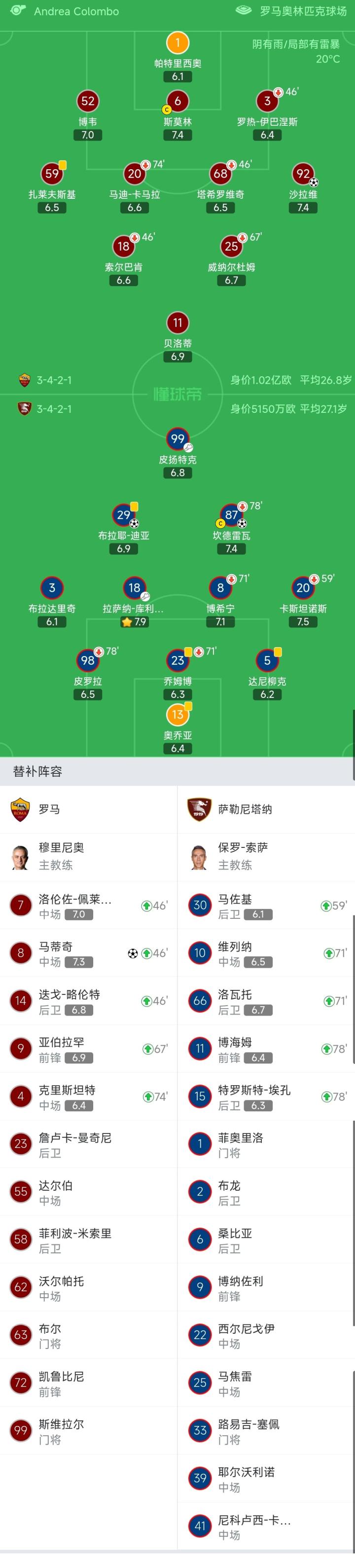 罗马首发:1-帕特里西奥、52-博韦、3-罗热-伊巴涅斯(46′14-略伦特)、6-斯莫林、92-沙拉维、20-卡马拉(74′4-克里斯坦特)、68-塔希罗维奇(46′8-马蒂奇)、25-威纳尔杜姆(67′9-亚伯拉罕)、59-扎莱夫斯基、18-索尔巴肯(46′7-佩莱格里尼)、11-贝洛蒂
