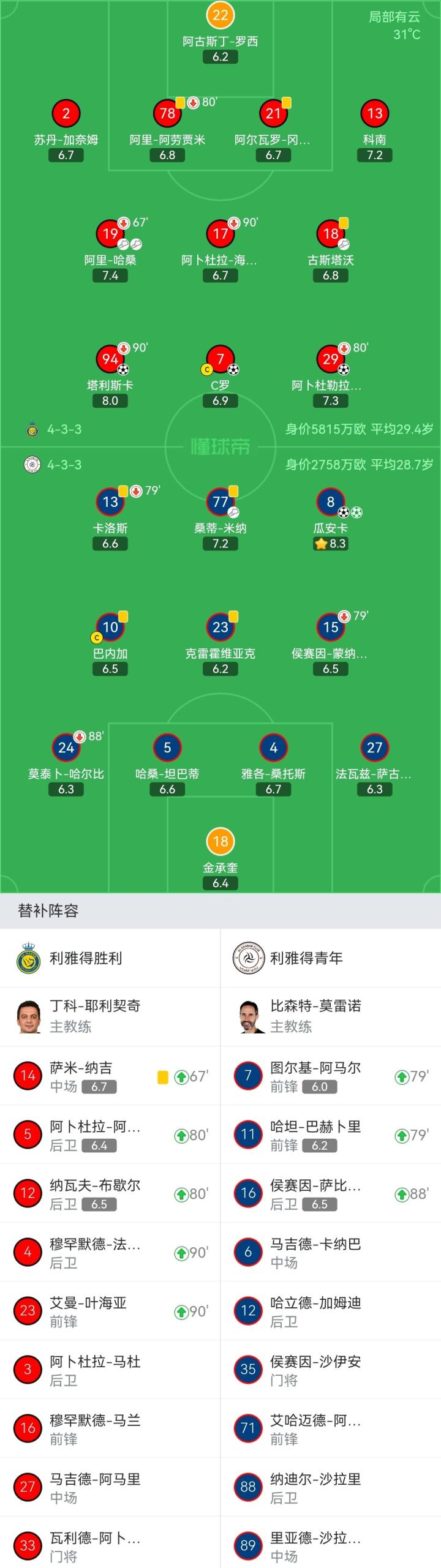 利雅得胜利首发:22-阿古斯丁-罗西、2-苏丹-加奈姆、21-阿尔瓦罗-冈萨雷斯、78-阿里-阿劳贾米(80'5-阿卜杜拉-阿姆里)、13-科南、17-阿卜杜拉-海巴里(90+4'4-穆罕默德-法蒂勒)、18-古斯塔沃、19-阿里-哈桑(67'14-萨米-纳吉)、94-塔利斯卡(90+4'23-艾曼-叶海亚)、29-阿卜杜勒拉赫曼-加里卜(80'12-纳瓦夫-布歇尔)、7-C罗