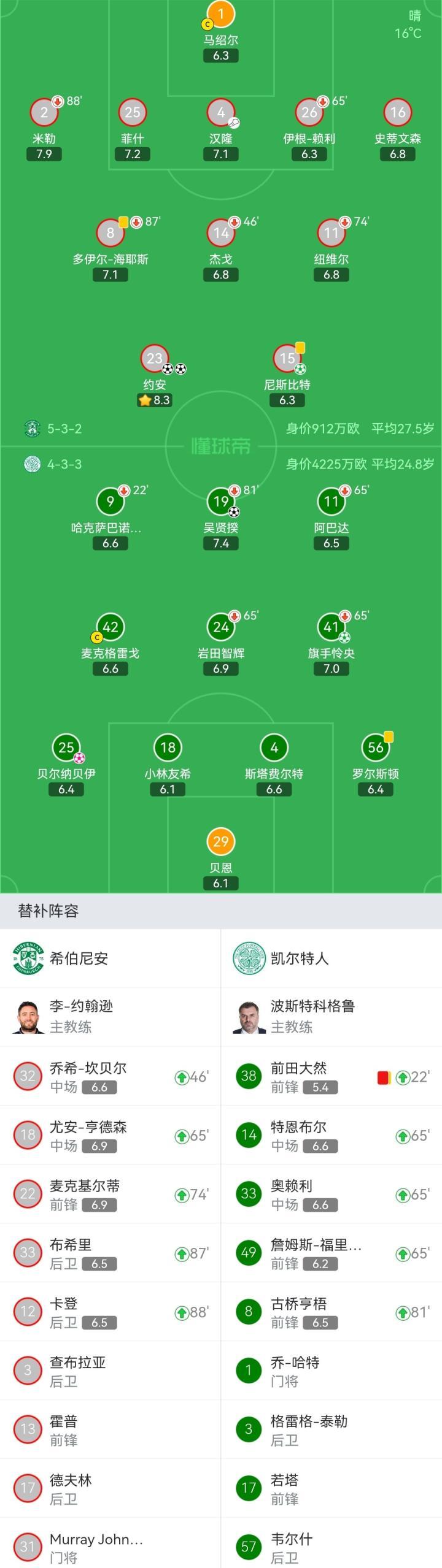 凯尔特人首发:29-贝恩、25-贝尔纳贝伊、18-小林友希、4-斯塔费尔特、56-罗尔斯顿、41-旗手怜央(65'14-特恩布尔)、42-麦克格雷戈、24-岩田智辉(65'33-奥赖利)、9-哈克萨巴诺维奇(22'38-前田大然)、19-吴贤揆(81'8-古桥亨梧)、11-阿巴达(65'49-詹姆斯-福里斯特)