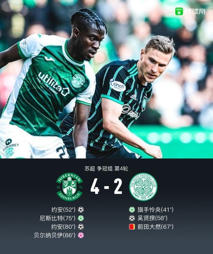 北京时间5月25日02:45,苏超争冠组第4轮展开争夺,凯尔特人作客复活节大道球场挑战希伯尼安。上半场,旗手怜央点射。下半场,约安凌空抽射扳平比分,吴贤揆破门助凯尔特人重夺优势,随后前田大然累计两黄被罚下,尼斯比特与约安分别建功,贝尔纳贝伊自摆乌龙,希伯尼安连入三球逆转。最终,十人凯尔特人客场2-4不敌希伯尼安。
