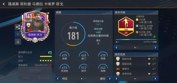 五周年传奇菲戈司职右边锋,配备了猎鹰天赋,对他的加速、射门、传中、弧线、盘带五项数据提升显著,这几项数据对于菲戈的边路突破、助攻、得分都有提升。花式方面,菲戈配备了高级油炸丸子,花式星级达到五星,他的盘带过人能力值得信赖。