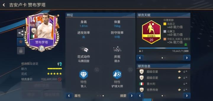 五周年传奇赞布罗塔司职右后卫,天赋配备了坚如磐石,对他的冲刺速度、长传、人盯人、侵略性、拦截五项数据有所提升,让他边路的速度表现得到增强。花式方面司职后卫的赞布罗塔配备了马赛回旋,再加上五星花式星级,这让他的持球能力达到同位置顶级。