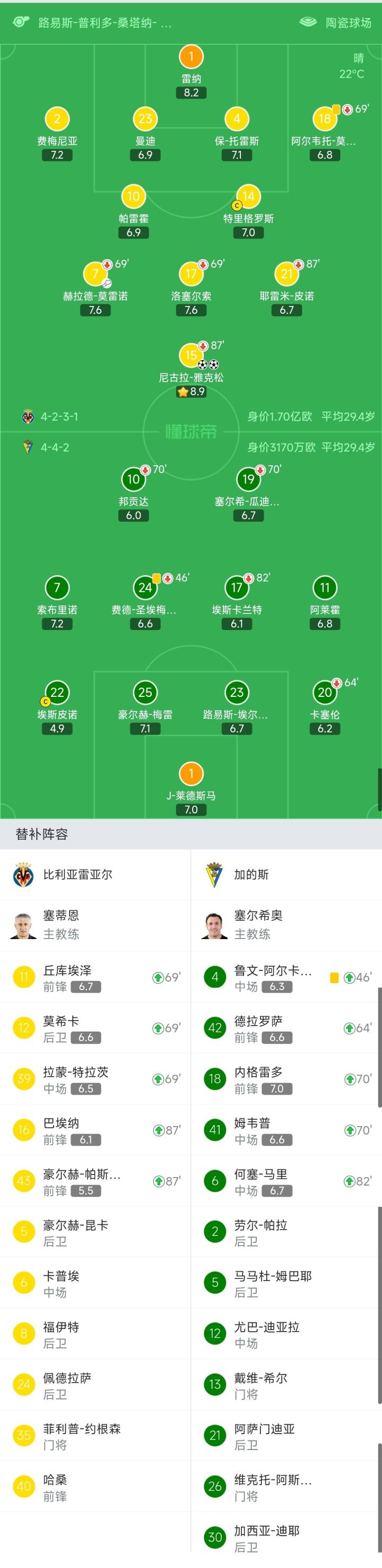比利亚雷亚尔首发:1-雷纳、18-阿尔韦托-莫雷诺(69′12-莫希卡)、23-曼迪、4-保-托雷斯、2-费梅尼亚、10-帕雷霍、14-特里格罗斯、17-洛塞尔索(69′39-拉蒙-特拉茨)、7-赫拉德-莫雷诺(69′11-丘库埃泽)、21-耶雷米-皮诺(87′16-巴埃纳)、15-尼古拉-雅克松(87′43-豪尔赫-帕斯夸尔)