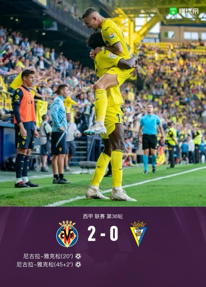 北京时间5月25日1:30,西甲第36轮,比利亚雷亚尔主场对阵加的斯。上半场雅克松1V2后过掉门将推射破门,之后特里格罗斯破门,但皮诺犯规在先进球无效,随后赫拉德-莫雷诺送出助攻,雅克松过掉门将推射破门完成梅开二度。下半场双方均无建树。全场结束,比利亚雷亚尔2-0加的斯。