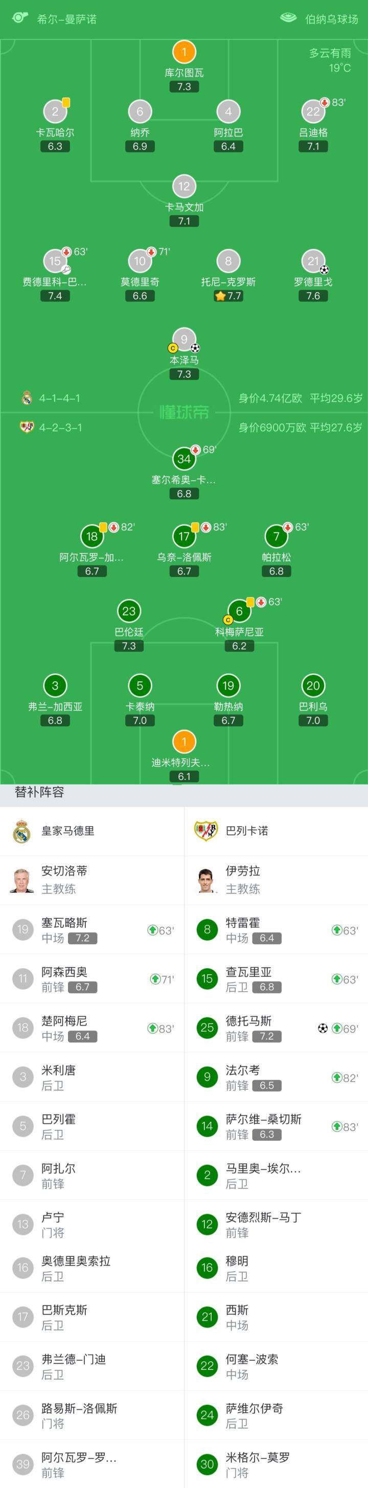 皇马首发:1-库尔图瓦、2-卡瓦哈尔、22-吕迪格(83'18-楚阿梅尼)、6-纳乔、4-阿拉巴、12-卡马文加、10-莫德里奇(71'11-阿森西奥)、8-托尼-克罗斯、15-费德里科-巴尔韦德(63'19-塞瓦略斯)、21-罗德里戈、9-本泽马