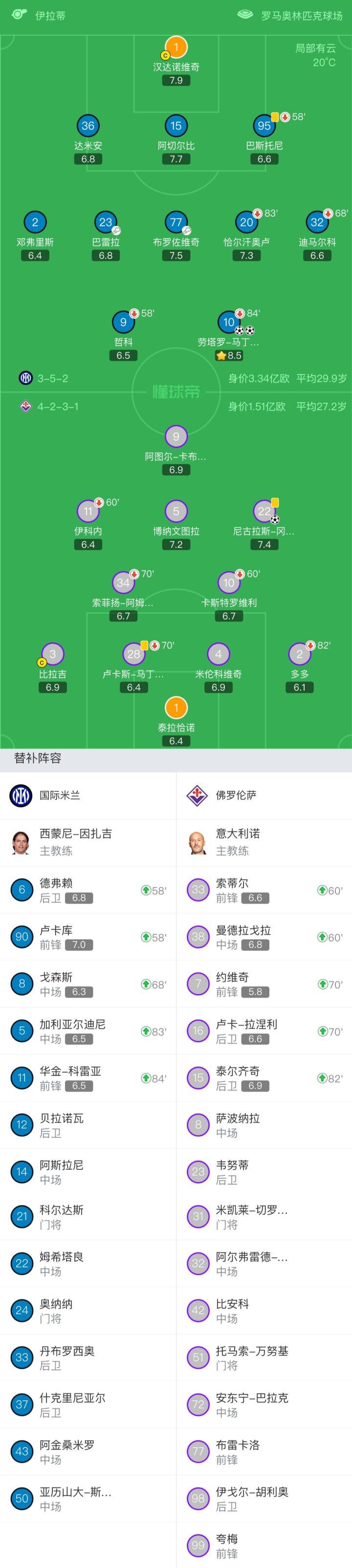 国米首发:1-汉达诺维奇、36-达米安、15-阿切尔比、95-巴斯托尼(58'6-德弗赖)、2-邓弗里斯、23-巴雷拉、77-布罗佐维奇、20-恰尔汗奥卢(83'5-加利亚尔迪尼)、32-迪马尔科(68'8-戈森斯)、9-哲科(58'90-卢卡库)、10-劳塔罗(83'11-华金-科雷亚)