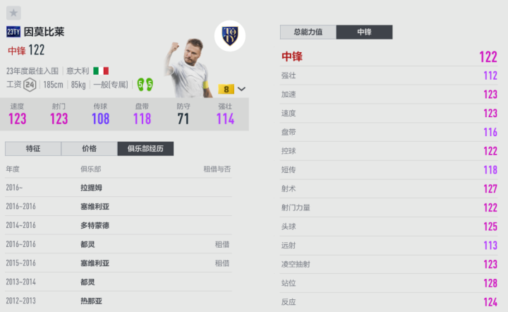 23TYN因莫比莱的面板属性很好,速度这项也没有短板,但是他不是一个典型的跑车前锋,不推荐频繁直塞找因莫比莱。这一点和莱万有些相像,都需要传控配合制造空间,再针对空当尝试直塞。因莫比莱的手感适中,被重点盯防时,做不来细活,不要太执着于单干。