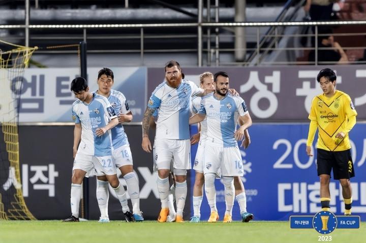 K2球队和K1球队唯一焦灼的比赛发生在全南,全南天龙在90分钟1-1和蔚山现代战平的情况下,最终在加时赛1球惜败,无缘八强。