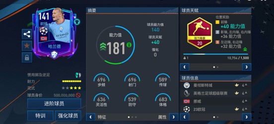 游戏中,哈兰德在欧冠活动推出的这张欧冠冠军之路版本球员卡实力非常强悍。天赋方面他配备了锋线球员常见的强力锋霸,这让他的终结能力大幅提升。