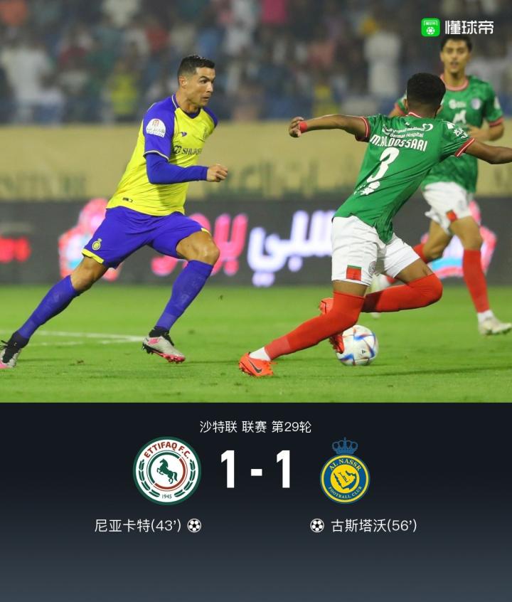 利雅得胜利1-1达曼协作获联赛亚军,C罗远射造险古斯塔沃破门