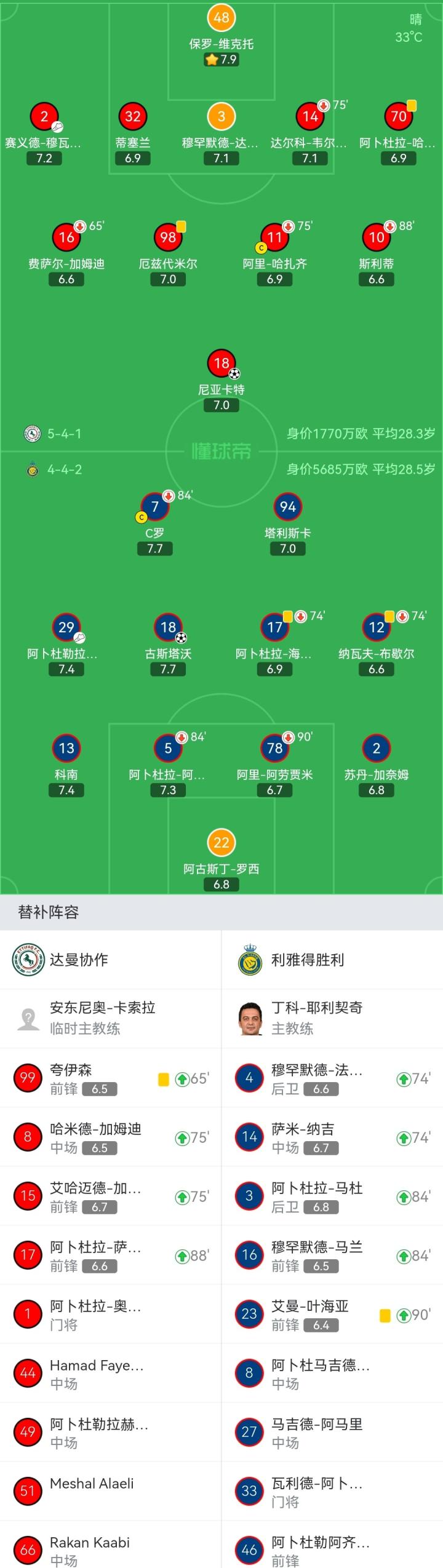 达曼协作首发:48-保罗-维克托、32-蒂塞兰、14-达尔科-韦尔科夫斯基(75'15-艾哈迈德-加姆迪)、3-穆罕默德-多萨里、2-赛义德-穆瓦拉德、16-费萨尔-加姆迪(65'99-夸伊森)、98-厄兹代米尔、11-阿里-哈扎齐(75'8-哈米德-加姆迪)、70-阿卜杜拉-哈提卜、10-斯利蒂(88'17-阿卜杜拉-萨利姆)、18-尼亚卡特