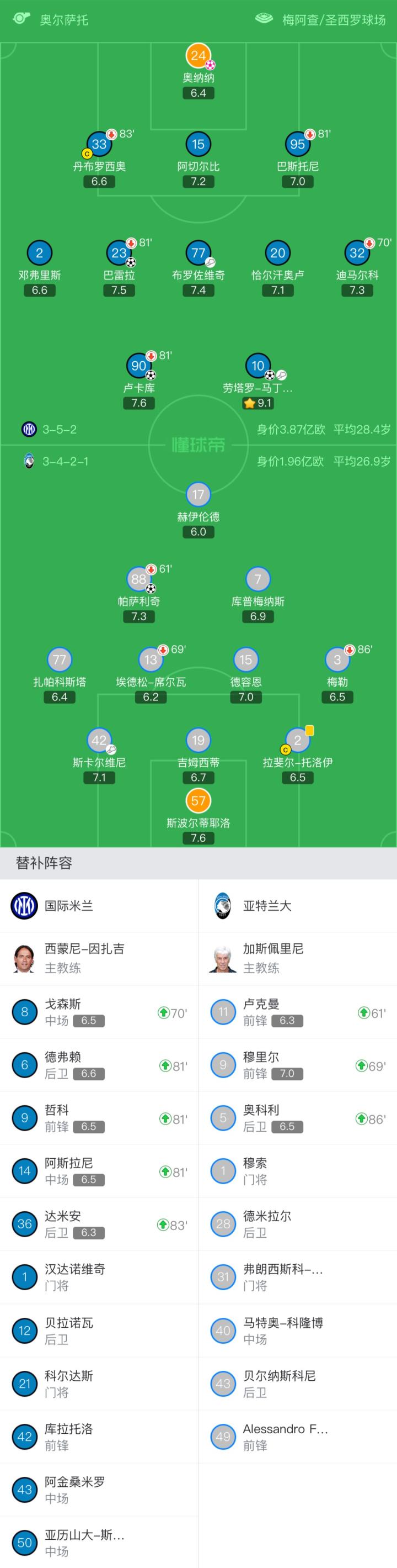 国米首发:24-奥纳纳、33-丹布罗西奥(83'36-达米安)、15-阿切尔比、95-巴斯托尼(81'6-德弗赖)、2-邓弗里斯、23-巴雷拉(81'14-阿斯拉尼)、77-布罗佐维奇、20-恰尔汗奥卢、32-迪马尔科(70'8-戈森斯)、90-卢卡库(81'9-哲科)、10-劳塔罗