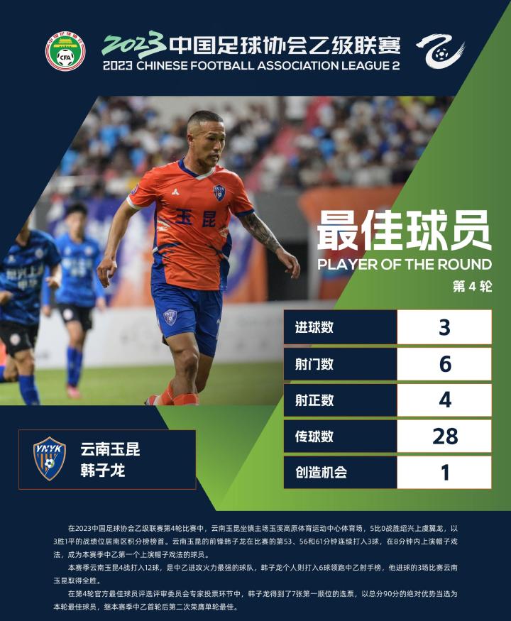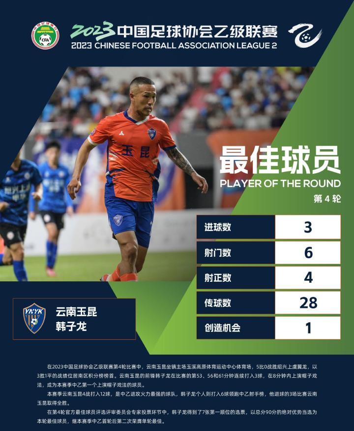 5月27日,中乙联赛官方公布了第4轮最佳球员,云南玉昆球员韩子龙凭借帽子戏法当选。