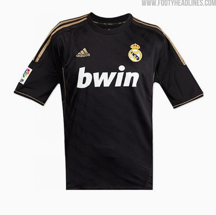 值得一提的是,皇马在2011-12赛季也曾有过类似的,以黑色为主,金色为辅的设计,那时候胸前广告还是bwin。