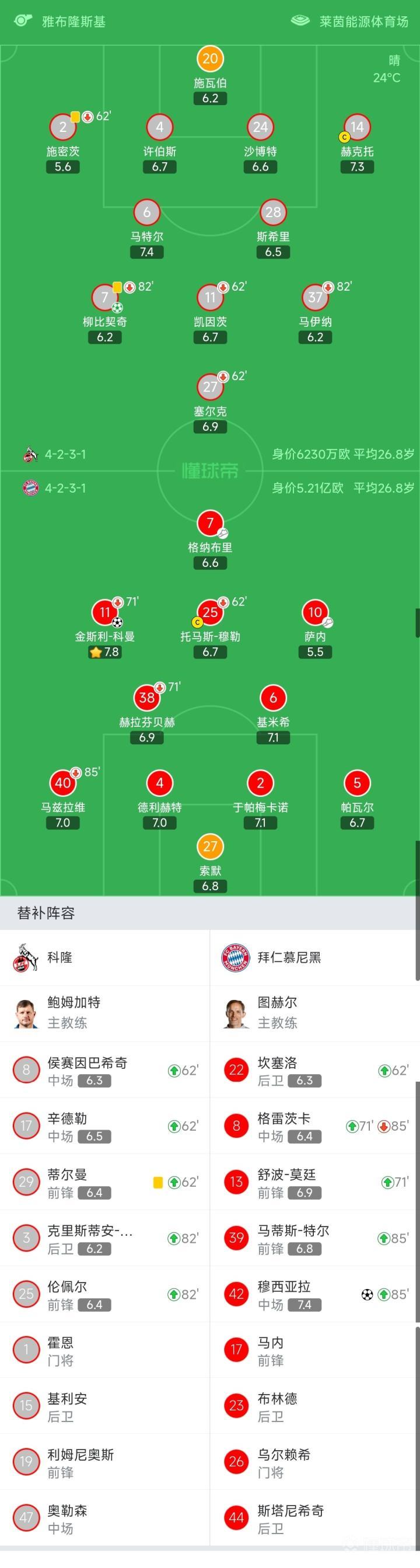 拜仁首发:27-索默、40-马兹拉维(85′42-穆西亚拉)、4-德利赫特、2-于帕梅卡诺、5-帕瓦尔、38-赫拉芬贝赫(71′8-格雷茨卡)(85′39-特尔)、6-基米希、25-托马斯-穆勒(62′22-坎塞洛)、10-萨内、7-格纳布里、11-金斯利-科曼(71′13-舒波-莫廷)