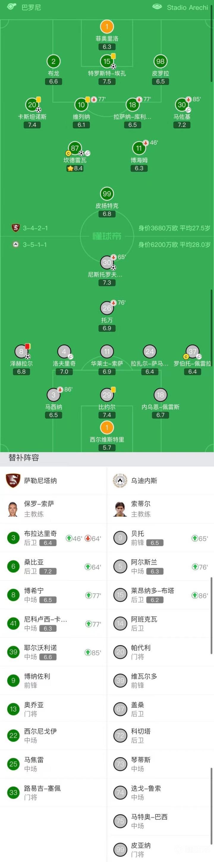 萨勒尼塔纳首发:1-菲奥里洛、2-布龙、15-特罗斯特-埃孔、98-皮罗拉、30-马佐基(85耶尔沃利诺)、18-拉萨纳-库利巴利(77'-45尼科卢西-卡维利亚)、20-卡斯塔诺斯、10-维列纳(77'45-博希宁)、87-坎德雷瓦、11-博海姆(45'-布拉达里奇63'35-桑比亚)、99-皮扬特克