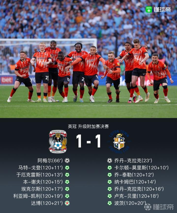 卢顿总分7-6点杀考文垂队史首次升入英超,达博踢飞生死点球