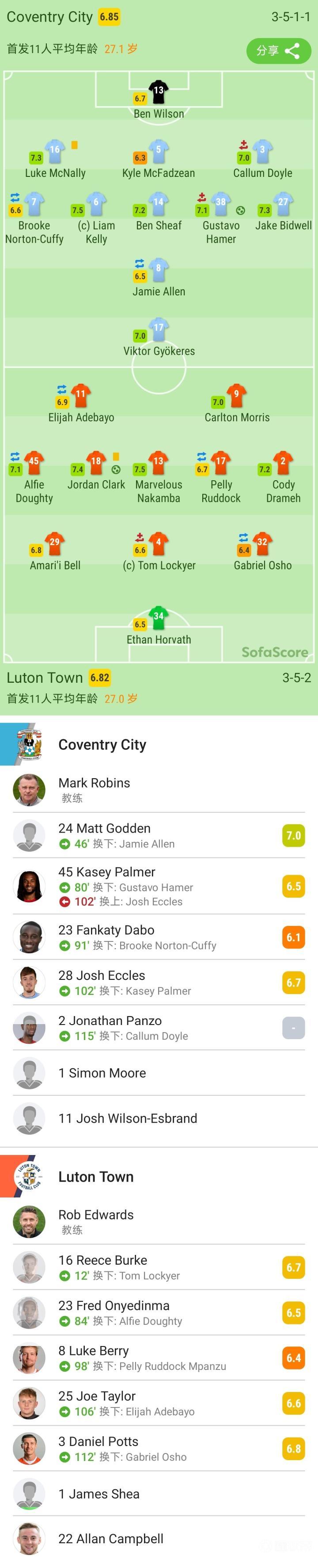 卢顿首发:34-霍瓦特、29-贝尔、4-洛克耶(12′16-伯克)、32-奥绍(112′3-波茨)、2-德拉梅、17-姆潘祖(98′8-卢克-贝里)、13-纳卡姆巴、18-乔丹-克拉克、45-道蒂(84′23-昂耶丁马)、9-莫里斯、11-伊莱贾-阿德巴约(105′25-乔-泰勒)